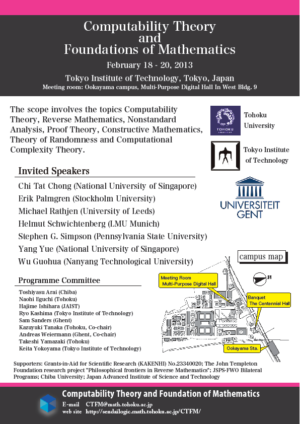 Computability Theory and Foundations of Mathematics (CTFM) aims to develop computability theory and logical foundations of Mathematics. The scope involves the topics Computability Theory, Reverse Mathematics, Nonstandard Analysis, Proof Theory, Constructive Mathematics, Theory of Randomness and Computational Complexity Theory.