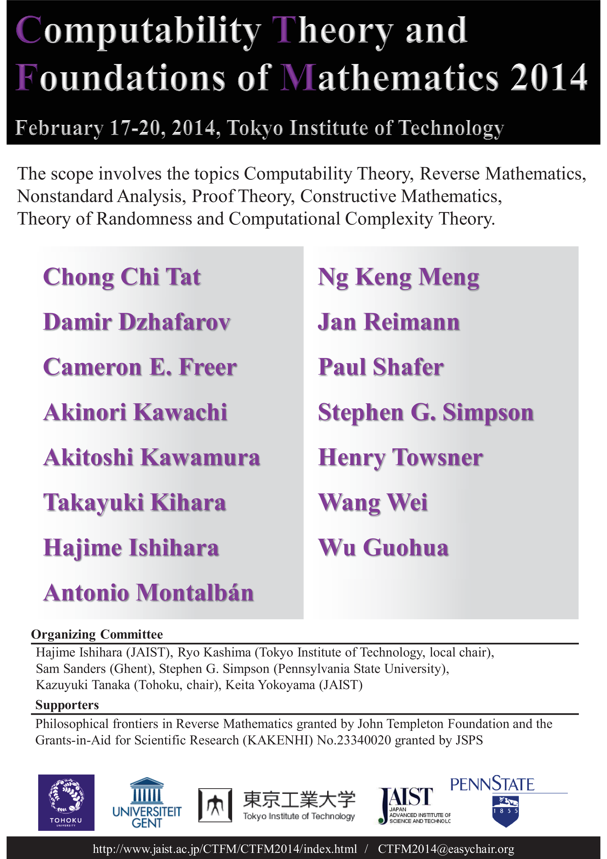 Computability Theory and Foundations of Mathematics (CTFM) aims to develop computability theory and logical foundations of Mathematics. The scope involves the topics Computability Theory, Reverse Mathematics, Nonstandard Analysis, Proof Theory, Constructive Mathematics, Theory of Randomness and Computational Complexity Theory.